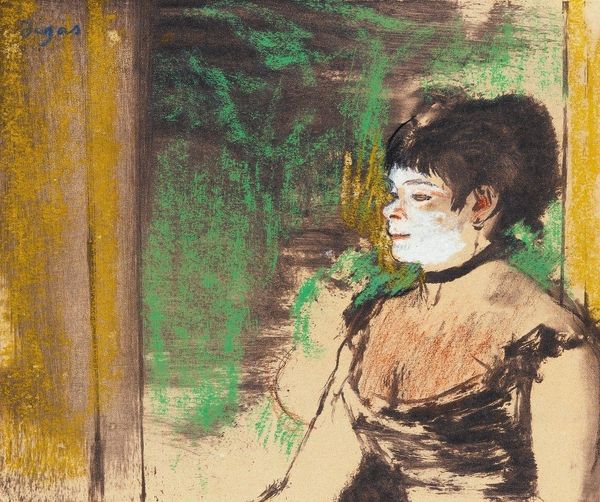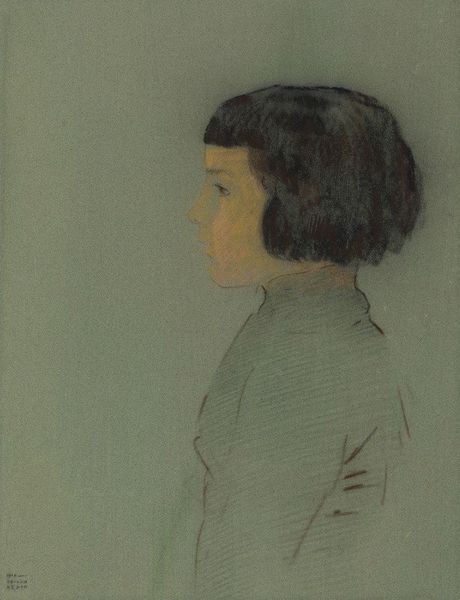 Curator: This is Édouard Vuillard's "The Child at the Door," painted between 1891 and 1892. It offers a glimpse into an intimate, domestic scene. Editor: It immediately strikes me as melancholic. The muted colors and shadowy doorway evoke a sense of quiet solitude. Is that child carrying a rather large piece of paper? Curator: Indeed. Notice how Vuillard employs watercolor to create soft, diffused forms. The chromatic range, though subdued, plays with the juxtaposition of cool and warm tones, thus creating depth in this interior scene. The wallpaper is also significant. Editor: The materiality of this watercolor—its transparency and lightness—contrast starkly with the density of the paint suggesting a domestic craft perhaps relegated as woman's work against a monumental piece made by male counterparts for gallery walls. Are we really that surprised to find wallpaper? It reads like any contemporary print. Curator: I find that you raise a most interesting idea in viewing this as "woman's work." Yet I'd also urge to consider Vuillard's choice to integrate surface design so completely. Here, the pictorial field becomes almost uniform; pattern and figure become difficult to differentiate. Editor: Interesting take! Vuillard certainly had a canny understanding of domestic labor, often assigned and deemed less "important," less 'worthy' of traditional galleries and exhibition. That door feels uninviting. I wonder if that patterned wallpaper Vuillard chose for his backgrounds might've seemed progressive at that moment... like "democratization" writ large. Curator: I interpret it through an almost psychological lens: The child at the threshold becomes emblematic of nascent consciousness, stepping out into the world with apprehension, almost as if afraid to "exit stage left." Her pallid skin against the rich, dark hues create quite a study. Editor: Seeing it this way, his layering reminds me that daily life involves labor: planning meals, creating welcoming spaces, all things, "unseen." So that watercolor feels less ethereal and light as the weight it is, an insight, both beautiful and daunting!