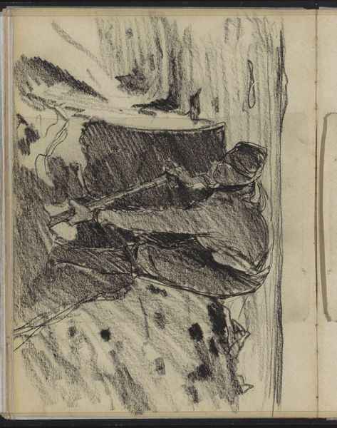Curator: It has this incredible melancholy mood, doesn't it? So somber... Editor: It certainly does. We’re looking at Willem Witsen’s, "Landscape with Digging Heath Farmers," a charcoal drawing on paper, dating from about 1884 to 1887. It’s part of the Rijksmuseum collection. The scale emphasizes that solitary figure in what I imagine as cold weather conditions, so a somber read is warranted. Curator: I think it’s more than just the weather and solitary figure creating that feeling. There's an element of… I want to say ancient ritual here. The heavy strokes of the charcoal, the earthy tones even without color, the way the figure blends with the land. It all evokes something primeval. What would the labor conditions of these workers at this moment in history reveal to us? Editor: That's a fascinating read on it! Labor during this time in the Netherlands was transitioning rapidly due to industrialization, though these rural communities certainly maintained agricultural legacies and identities. This piece likely depicts seasonal peat harvesting that generated fuel during winter months for additional income. I think the harshness and intensity you’re sensing come from a brutal economic reality, depicted using realism as a style. The symbolism seems embedded in the scene rather than something imposed upon it. Curator: I see your point. Perhaps it is less about a specific ritual and more about a timeless connection to the land. And even without specific colors, Witsen captures the feeling of the soil, of the cold, almost like memory of how essential hard labor of working men impacts land, nature, and overall sense of homeland. The man with his shovel could just as easily be a sower of seeds, representing future of prosperity and hope, which balances any cold or harsh implications. It resonates, historically, but also speaks to broader cycles. Editor: Yes, I appreciate that interpretation. It shows how a seemingly straightforward depiction of labor can tap into deeper cultural narratives of our human relationship to nature, a history both shaping and shaped by those interactions. Curator: Exactly. Thanks, it shifted my perspective significantly, making me wonder if there isn’t something subtly archetypal at play that is a signifier of historical continuities. Editor: And for me, considering Witsen's social milieu enriches how I see his observations—turning a scene of common labor into something genuinely contemplative about the landscape of people and place.