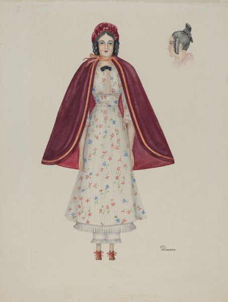 Editor: Here we have "Bulto, Santa Rita," a work by Majel G. Claflin, circa 1937. From what I can tell, it looks like a drawing or watercolor of a traditional wooden sculpture, maybe even folk art? The muted colors give it a very reverent feel, almost like peering into a sacred space. What draws your eye when you look at this piece? Curator: You know, it's funny, my first thought goes straight to my abuela’s stories, the way she’d describe these very similar figures… almost like whispering secrets of the old country, right? Look how Claflin captures that stilled, almost yearning gaze. It’s not just a portrait, but a captured spirit. Don't you feel a sense of watching someone in a profound state of prayer, of utter dedication? Editor: I do see that now that you mention it. I was so caught up in the overall form I missed some of those more subtle cues in her face, like the positioning of the hands, that convey supplication. Curator: Exactly. And that’s where it gets truly fascinating, don't you think? It’s almost as if Claflin is inviting us to consider not just what Santa Rita *looks* like, but the very *essence* of devotion. The way light and shadow plays across the painted surface... it mimics the same dramatic lighting one finds inside old village churches, and hints at stories untold. Now, why do you suppose she chose such a simple color palette? Editor: Maybe to draw attention to the figure itself and the devotional act, cutting out distraction? I like that, I think it works. Curator: Couldn't agree more. See, and that’s the lovely dance, isn’t it? How an artist, with simple strokes and colours, can whisper a whole culture, a whole history into being. Editor: This has totally shifted my perception. I initially saw it as a simple rendering, but now I understand how Claflin imbued this work with deeper layers of meaning and emotion. Thanks for sharing your perspective!