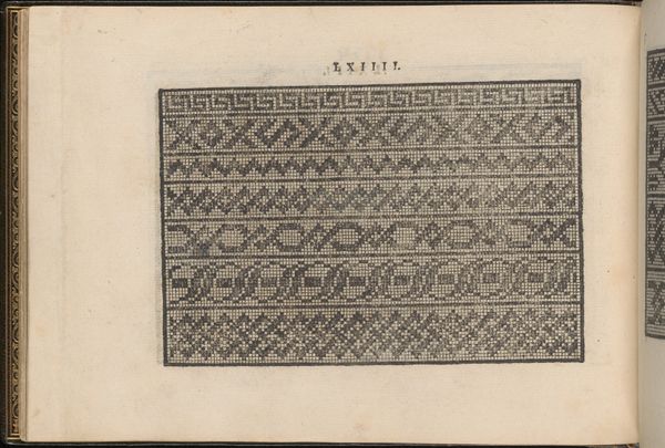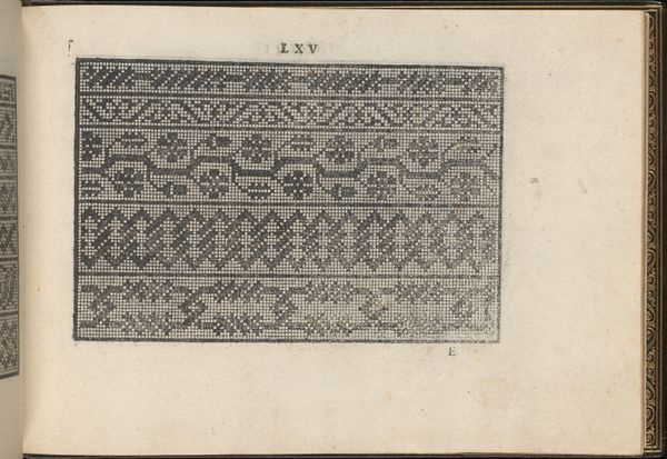 This is page 34 from "La Vera Perfettione del Disegno," an early 17th-century book by Giovanni Ostaus demonstrating embroidery patterns. The image presents bands of geometric designs, each formed by a grid-like structure of small, repeating shapes. Consider the lozenge motifs. They echo patterns found in ancient textiles, from Incan weavings to early Roman mosaics. These aren't just decorations; they are visual echoes of cultural memory, carrying a resonance that transcends mere aesthetics. The diamond or lozenge shape, for instance, has appeared in countless cultures across the globe and through millennia, often symbolizing the vulva and representing fertility and the earth goddess. This symbol’s evolution reveals how primal human concerns—fertility, protection, and continuity—are woven into the fabric of our visual language, resurfacing in altered forms in different historical contexts. These patterns persist, evolving yet retaining echoes of their origins, demonstrating the powerful, non-linear continuity of human expression.