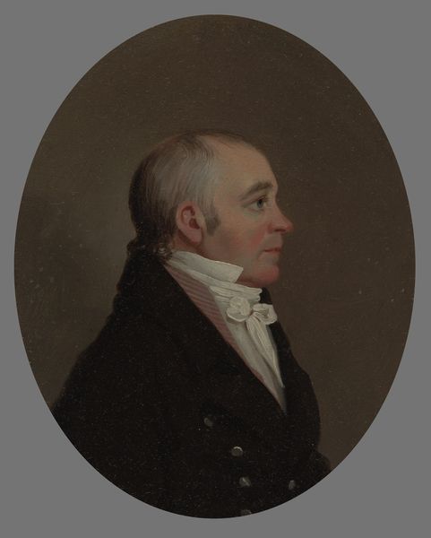 Editor: This is "Portrait of Moses Kimball" painted around 1808 by William Jennys. It’s an oil on canvas. What immediately strikes me is the directness of his gaze; he’s looking right at us. What do you make of it? Curator: The direct gaze is certainly compelling. Beyond that, I am drawn to the formal attire – the cravat, the dark coat with its rows of buttons. What might these signify about Kimball’s identity or aspirations in the early 19th century? Consider what visual echoes resonate today with symbols of power. Editor: Well, it definitely speaks to a certain social status, a respectable figure. It feels very intentional, almost like he's trying to project an image. Curator: Precisely! The question then becomes: what image? Note the way the artist captures the sitter’s particular, slightly asymmetrical features. Does that undermine, or reinforce, the projection you identified? Think about the symbolism embedded in portraiture itself, a lasting legacy. Editor: I see what you mean. It's both idealized and quite human at the same time. So it's not just about status but also about individual character? Curator: Indeed. Perhaps this juxtaposition, of status and individualized elements, tells us something more profound about early American identity during this time of societal shift. What symbols and projections are we crafting today in our own portraiture? Editor: That's a fascinating way to look at it; I hadn't considered the connection to contemporary portraiture and its purpose. Curator: Looking at historical symbolism, you see cultural memory reflected in seemingly simple compositions like this portrait, which is a continuity, if we reflect on it consciously.