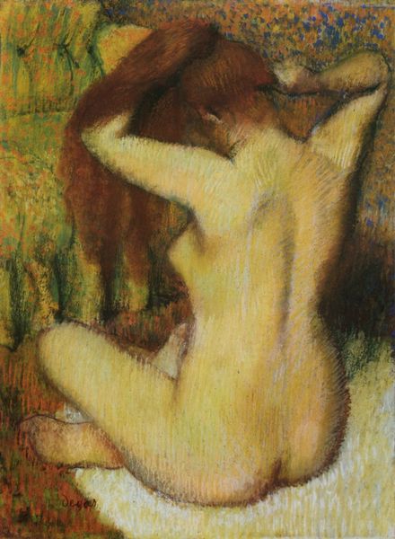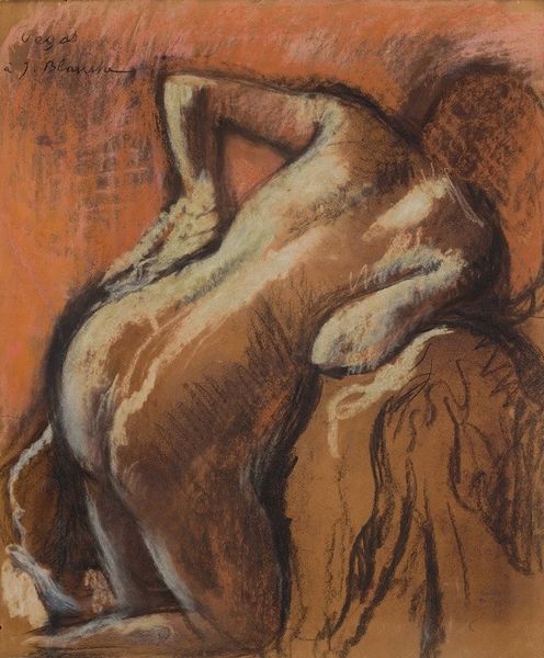 Curator: This is “Bather from the Back,” an oil painting attributed to Pierre-Auguste Renoir. The current location is listed as Private Collection, unfortunately lacking a specific date for now. What's your first impression? Editor: Hmm, intimate. It's the pose, averted, turned away... almost a sense of vulnerability despite the subject matter. Curator: It’s certainly striking, the woman's figure, viewed from the back, takes center stage. It invokes a lot of different discussions we could be having in this space, in light of impressionistic and modern figure representation. Editor: Absolutely, and how it continues certain threads... Nudity as an expression of freedom, an echo of classical forms. But it also complicates that narrative; the shadows, the obscured face. Is this a celebration, or something more conflicted? Curator: The impressionistic style itself contributes to this ambiguity. Renoir's brushstrokes, thick and somewhat undefined, allow for multiple interpretations. The question of power dynamics remains ever present when we unpack it with the awareness we have in contemporary times. Who is the intended viewer? What does that gaze signify? Editor: There's an interesting push-pull happening, visually. The heaviness of her hair against the lighter drape creates a visual anchor... suggesting stability amidst all this transience that is commonly assigned to impressionist works. The curves of the figure resonate beyond any potential context. There is that echo of the eternal feminine. Curator: I see your point about its relation to this timeless archetype, but I find myself wondering about the politics inherent to representing women in this way, even in private collections... is this intimacy celebratory, or is it an imposition? Editor: Both, perhaps? It speaks to the contradictions inherent in depicting the human form. The enduring appeal of certain forms persists, alongside critical reevaluation. Curator: It's this continuous engagement, the back and forth, that allows a richer understanding of art. The way the conversations change with us as viewers. Editor: Indeed. Looking closely invites contemplation and fresh viewpoints. A way for us to keep learning and exploring.