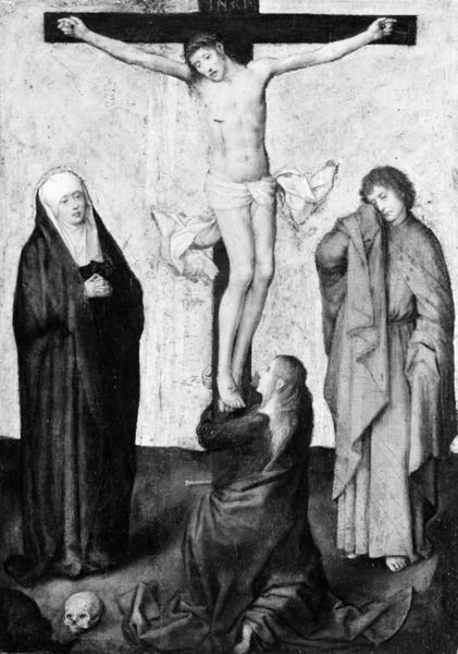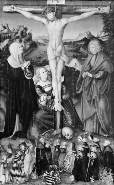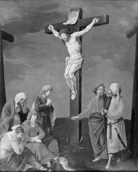 Editor: This painting, "Christ on the Cross between the Virgin Mary and St John," dating from 1796-1805, depicts a scene of profound sorrow. It’s rendered in monochrome which accentuates the rawness of the subject. It seems so stark. What are your initial thoughts on this particular rendition? Curator: What strikes me immediately is not simply the representation of Christ's crucifixion, but the tangible presence of loss and suffering. Consider the pigments: where did they come from, who ground them, and how were they processed? It speaks to a specific availability of resources and a pre-industrial mode of production defining the labour and economic landscape of the late 18th century. Editor: I see what you mean. The limitations of the materials available certainly shaped the final piece. Can we relate this also to artistic decisions? Curator: Precisely! And how might these material conditions reflect a certain artistic or social agenda? Notice how the anonymous artist utilizes chiaroscuro to emphasize the physical suffering. How much did their economic standing and that of the commissioning party weigh upon choices in quality? It speaks to both personal artistry and material constraint, doesn't it? Editor: It definitely casts a new light. Instead of just seeing religious figures, it’s like understanding the complex web of labor that brought the painting to life, and how its constraints affected the message and presentation itself. Curator: Exactly. We see the finished painting as a historical and cultural artifact, with process and available material shaping a certain way in communicating these strong emotive responses. Editor: Thanks! I will look at art and its materiality with a fresh perspective going forward! Curator: Indeed, let's remember that even art's creation exists within material reality.