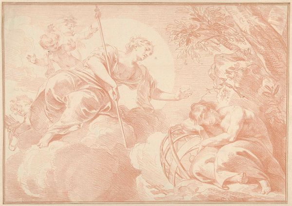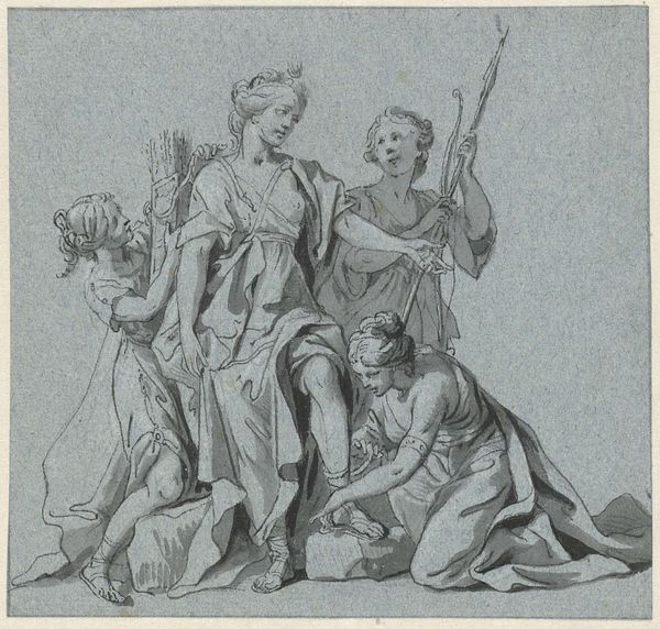 Jacob de Wit made this drawing, "Justice and Kindness," probably in the 1730s, using pen and brown ink, brush and gray wash, with white opaque watercolor on paper. The artist used traditional drawing materials to create a preparatory sketch. The gray wash creates tonal variations, while the white watercolor highlights forms. The artist has used thin lines and broad strokes to create this sketch. It is full of movement and energy; it is not a static depiction. Here, we can see De Wit experimenting with the expressive qualities of the ink. Look at the scales and rods near the feet of Lady Justice. The sketch demonstrates the artist's command of materials and methods and would have been essential to producing a successful painting or fresco. The drawing's loose and informal approach challenges traditional distinctions between fine art and craft. The artist's process is essential to understanding the artwork's full meaning.
