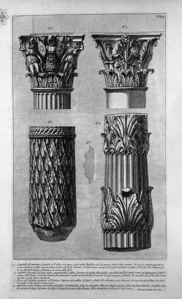 Editor: So, here we have an engraving by Giovanni Battista Piranesi, titled "Columns Doric, Corinthian and Tuscan (from Le Roy)." It depicts different architectural columns with very precise line work. The overall mood feels very formal and academic. What do you see in this piece? Curator: Beyond the formal depiction, I see a powerful statement about cultural appropriation and reinterpretation. Notice the explicit comparison of Roman and Greek forms in the text – "Etruscis et Romanis…prius quam Graecis." Piranesi isn't just illustrating column styles; he's subtly engaging with the debate around the origins of classical architecture and the power dynamics inherent in attributing them. Do you think this challenges conventional narratives of architectural history? Editor: That's fascinating. I hadn't considered it beyond a technical drawing. So you're saying the organization and the descriptions challenge a simple understanding of historical progression? Curator: Exactly. By highlighting the Roman appropriation, Piranesi indirectly critiques the assumed superiority of Greek architecture and brings attention to how power structures influence the narratives we create about art and its history. Think about how often we prioritize certain cultures or periods while marginalizing others. This print invites us to consider whose voices are amplified and whose are silenced in the construction of architectural history. Editor: This definitely gives me a lot to think about regarding cultural influence and the presentation of history. It's more than just columns! Curator: Indeed. This work teaches us that even seemingly objective documents like architectural engravings are embedded with social and political commentary, ripe for interrogation. Editor: I'll never look at architectural drawings the same way again!