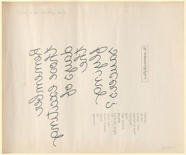 Guy de Cointet made this drawing called ‘When Radar was New’ on a sheet of paper, writing with what looks like black ink. The looping script really stands out; it's like each word is trying to be its own little sculpture. Up close, you can almost feel the artist’s hand moving across the page, deciding how much pressure to apply, each letter kind of dancing on the paper. Look at the word ‘dominant’ – the way the letters stretch and squeeze together creates a rhythm that’s almost musical. The ink is a deep, solid black that really pops against the off-white of the paper, making you focus on the shapes and spaces between the letters. This piece reminds me a little bit of the work of Jess Collins, who also played around with language and visual form. It makes you wonder: Is it a message? Is it a code? It's like de Cointet is inviting us to play along, to find our own meaning in his beautiful, strange writing.