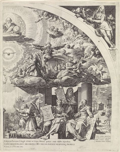 Curator: Philips Galle’s "Temperance," or "Temperantia," dating from about 1559 to 1564. This engraving on paper is part of "The Virtues" series, a fascinating exploration of moral principles rendered with remarkable detail. What's your first take? Editor: Crowded! That's the first thing that leaps out. It feels like a fever dream rendered in lines – an intricate clockwork mechanism about to spring apart, but held together by the central figure. The eye dances all over, not knowing where to settle. It's like he’s stuffed so much stuff that it might be like too much to take in for one painting, I think. Curator: Precisely! The density is very typical of Northern Mannerism. Look closer. The central female figure, Temperance, is almost radiating a strange calm amidst the chaos. She holds the reins, so to speak, representing moderation, even as madness unfolds around her. The balance in design is a powerful message about staying stable. Editor: You’re right. I get this vibe like a ship in a storm—everything's tilting and about to go sideways, but she’s totally centered, and calm, like there isn’t trouble going around in circles. So all these little groups acting out vices all over...what's that about? Is it the kind of like the world turning to rubbish? Curator: Consider each vignette as an antithesis to temperance. Excess in music and art, financial impropriety. Galle shows how people become obsessed, how societies, if unchecked, can tip toward ruin through intemperance. It's a didactic piece, a very powerful warning couched in allegory, cultural commentary of then times. Editor: So, less about preachy "be good" and more like, "Look, society's a house of cards if we're not careful?" With maybe a little smirk there. Almost like he doesn’t fully think these virtues he is talking about matter. Like everyone in their heads can be the most sane but when together are always wrong. Like, maybe it’s too much effort and drama if they tried so much, and nothing happened at all. Curator: A subversive reading, certainly. But even subversion reinforces the central ideal. Galle compels us to confront these extremes, thereby keeping the conversation about balance relevant, even today, a few centuries later. It gives meaning when the observer considers. Editor: Absolutely. It’s the kind of picture you could spend days in, picking apart all its little stories. Temperance, at least, will keep me coming back, if only for that calm center in the tempest.