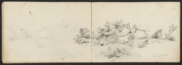 Curator: This double-page drawing from Johannes Tavenraat is titled "Landscape with Figures after a Painting by Barend Cornelis Koekkoek" and dates from between 1842 and 1868. Editor: Mmm, sketchbook vibes. The landscape melts away into a soft haze, punctuated by that gnarled, almost ghostly tree on the right page. It’s like a memory fading, a romantic daydream… Curator: It's fascinating to see Tavenraat engaging with the work of Barend Cornelis Koekkoek, who was known for his idealized landscapes in the Romantic style. The sketch, created using pencil and pen, showcases how artists absorbed and reinterpreted established visual languages. We're not simply looking at a landscape; we are observing an artistic dialogue across generations. Editor: That ghostly tree…it is almost calling us in a spooky, silent tone to another realm. A kind of bridge—no pun intended because of the small structure at the right side!—into Koekkoek's painted imagination and a window into Tavenraat's interpretation. It gives me goosebumps in an inviting way. Do you think these personal sketchbooks offered the artist an expressive freedom which was very separate from his role in more 'formal' creative roles? Curator: Precisely. Sketchbooks often acted as spaces for exploration, free from the pressures of the market or the expectations of patrons. Artists could experiment with compositions, techniques, and ideas in a more uninhibited manner. The Romantic era prioritized emotional response and individual interpretation. This sketch suggests the artist, Tavenraat was working out his personal connection to Koekkoek's established style and maybe the artist’s interpretation of ‘idealised landscape’. The unfinished quality only enhances the work's reflective feel. Editor: The contrast between the more rendered left page and the sparser right side highlights the process. It’s not just the destination; it’s the journey. Looking at it, it makes me wonder if all landscapes, even the "idealized" ones, start as personal sketches, a way to map our inner terrain. Curator: Indeed. It is through these quiet observations and reinterpretations that artists shape the world around them. Thanks for sharing your impressions with me. Editor: It has been a great discussion about how art shapes the artist's soul and its creative mind!