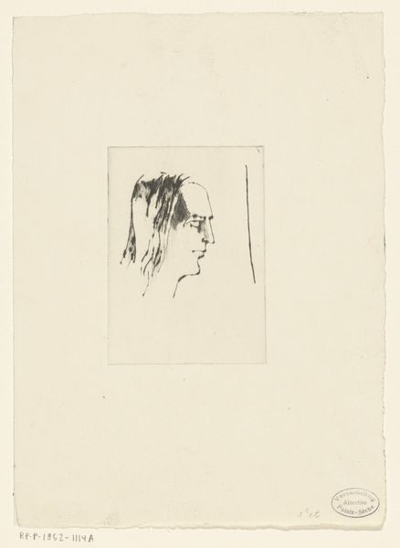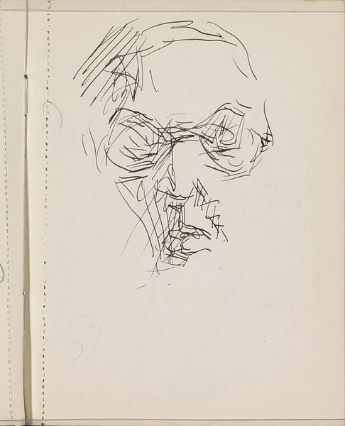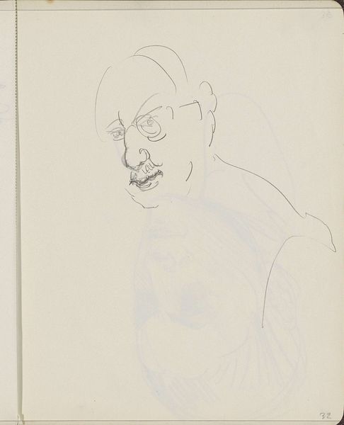 Editor: This is Barry Flanagan’s "Jack Wendler," a framed drawing held at the Tate. It's a very simple line drawing, almost austere. What do you see in the composition of this piece? Curator: The economy of line is striking, isn't it? Note how a single, unbroken contour defines the brow and spectacle frame, suggesting form with minimal means. It reflects a concern with pure form and the essence of representation. Editor: It's fascinating how much information is conveyed with so little. Did artists often create line art? Curator: Line art in this style emphasizes the fundamental structure, divorcing itself from the decorative or emotive. What do you think that kind of pure style adds to the piece? Editor: It's so simple it's hard to make a deeper connection. I see your point about the focus on the structural form. Curator: Exactly. And that formal emphasis invites us to consider the very nature of line and its capacity for representation. Perhaps a sketch as preparatory work for something more? Editor: I hadn't thought of that, but it makes sense. Thanks!