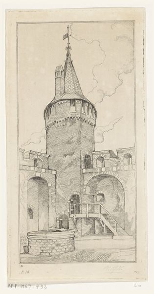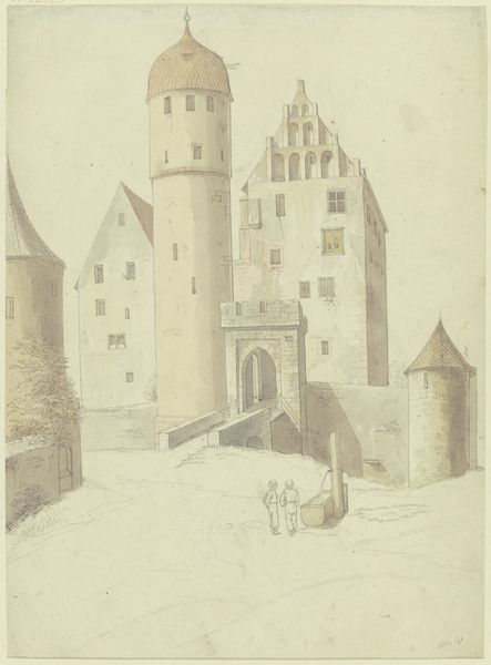 Curator: Today, we are observing Karl Ballenberger’s pencil drawing of “Burg Katzenstein bei Frickingen” exhibited here at the Städel Museum. Editor: My first impression is that of stark, subdued monumentality. The limited tonal range gives it a somewhat melancholic feel, as if the scene is fading into memory. Curator: Indeed. Ballenberger was working within the emerging romanticism style of the early 19th century. His landscape emphasizes feeling over pure representation and reveals something of the shifting relationship with architectural heritage, as medieval castles came increasingly under pressure during widespread transformations to agriculture and industry. Editor: Note the geometric structure—how the angularity of the rocks below sharply contrasts with the softer lines of the buildings around. Also, notice how he leads your eye with faint lines. Curator: The composition skillfully juxtaposes the imposing castle structure with the surrounding natural landscape. He's not merely documenting a landmark; he's embedding it within a narrative of place and time. What also becomes evident here is the growth of tourism; picturesque images like this became popular as souvenirs, feeding back into interest around these heritage sites. Editor: Looking at the facade of the central tower and its meticulous linework, one has to marvel at the craftsmanship and precision applied within a rather understated drawing. Even with minimal shading, the solid volume feels imposing, dominating the site with almost brutal verticality. Curator: Absolutely. These Romantic depictions are laden with political connotations as German identity, specifically linked to such cultural heritage sites, developed to forge connections through shared culture during this period. Artists and writers amplified these ideas through publications about national antiquities, with images like this serving as evocative visual documentation. Editor: From a purely compositional point of view, Ballenberger makes remarkable use of line and perspective to lead the viewer through various planes into this image, rewarding viewers with prolonged observations, like an actual architectural site! Curator: That's precisely what's intriguing here. It functions both as art and artifact. Editor: I now leave with renewed respect for pencil work! Curator: A great example of an artist shaping national perceptions through place.