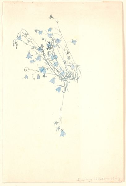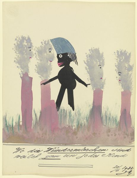 Curator: Looking at John Elsas’s "13426 (_One confuses …_)" created in 1931, we find a whimsical collage incorporating watercolor and drawing. It's part of the Städel Museum collection. What's your immediate take on it? Editor: Well, it strikes me as a melancholy spring. The floral imagery is abundant, but the lone four-leaf clover feels like a spot of wistful darkness, especially offset by that odd blue cutout of a figure. It gives the piece an air of ambiguous longing. Curator: The symbolism is quite potent. Elsas often embeds layers of meaning through seemingly simple compositions. Notice the use of the four-leaf clover, a universally recognized symbol for luck contrasted by its singularity against the backdrop. This immediately hints at luck that might be isolated, unique or perhaps even elusive. Editor: Absolutely, and it really plays on expectations, doesn't it? You expect the lucky clover to bring an element of joy or hope but it’s rendered so starkly. It's like a shadow intruding on a field of supposed bliss. The flowers themselves, the masses of purples and pinks almost read like a hazy memory or dream, which intensifies the overall sense of wistfulness. Curator: Also observe the script beneath. Handwriting as a form of personal expression can reveal more profound narratives when coupled with symbolic images. The relationship here deepens our understanding. Language provides a more concrete layer which creates additional meaning from the imagery above. Editor: It definitely grounds the abstract feelings swirling around in the floral upper half. The script gives it that additional intimate, confessional touch that lets the collage resonate as something intensely personal. Curator: The blending of modernist elements with symbolism opens many paths of interpretation. A journey through inner landscapes visualized using outer ones. Editor: Yes, at first glance, it feels simple. But the more you look, the more complicated and fascinating the whole thing becomes. What starts out as this pretty, slightly quirky piece, transforms into this emotionally complicated and almost melancholic piece. It’s interesting how so much is hinted at. Curator: It reminds us of how art can function like memory— fragmented, symbolic, and deeply resonant.