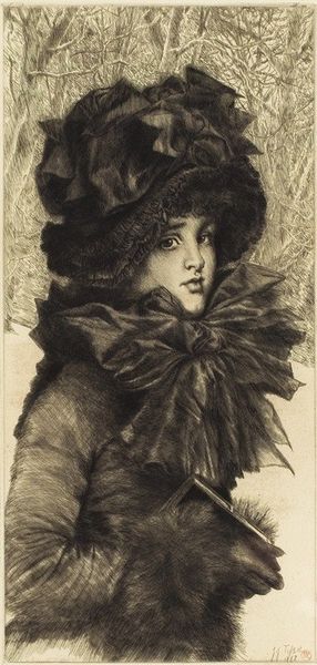 Editor: Here we have Vladimir Makovsky’s "Girl with a Clutch," created in 1884. It’s striking how her gaze meets yours, even though the fur muff obscures half her face. What do you see in this piece beyond a simple portrait? Curator: This image invites us to consider the performative aspects of femininity in Tsarist Russia. The luxurious fur accessories speak volumes about class and social status, but the way she holds the muff almost as a shield suggests a vulnerability. Editor: A shield, that’s interesting. Do you think she’s trying to hide, or is there something else at play? Curator: I think it's a multifaceted statement. While the attire signals privilege, it could also signify the constraints placed on women of that era. The clutch becomes a barrier, both protecting her and preventing genuine connection. Think of it as a visual representation of the societal pressures on women to maintain appearances while navigating a patriarchal structure. How might her social standing affect her lived experiences and her personal agency? Editor: So, you’re suggesting that the portrait critiques the very society that affords her this status? Curator: Precisely! Makovsky was known for his social commentary. This "Girl with a Clutch" becomes less a celebration of beauty and more an observation of the complex, sometimes contradictory, roles women were forced to inhabit. The soft brushstrokes contrast with her direct stare; that really emphasizes a hidden defiance. Editor: I see it now. The painting uses her posture to hint at something deeper than just wealth. Thanks for expanding my interpretation! Curator: My pleasure. Art is a conversation, and these pieces always offer new insights as our understanding of social dynamics evolves.
