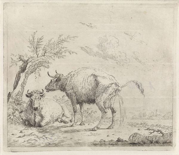 Pieter Gerardus van Os created this etching, Liggende koe met distel, which translates to reclining cow with thistle, during the late 18th or early 19th century. It depicts a serene pastoral scene, a popular subject during a time when the Netherlands was undergoing significant social and economic changes. The image creates meaning through its subtle details and cultural references. The cow, a symbol of agrarian life, is rendered with careful attention to its form and texture. The thistle in the foreground adds a touch of realism to the scene, while the vast, empty landscape evokes a sense of tranquility and harmony with nature. Van Os was working at a time of significant political and economic transition for the Netherlands. He may have been motivated to reflect on the simpler virtues of the countryside. Studying Van Os’s prints alongside agricultural records or other visual depictions of Dutch rural life would reveal much about the social meaning of this kind of imagery.