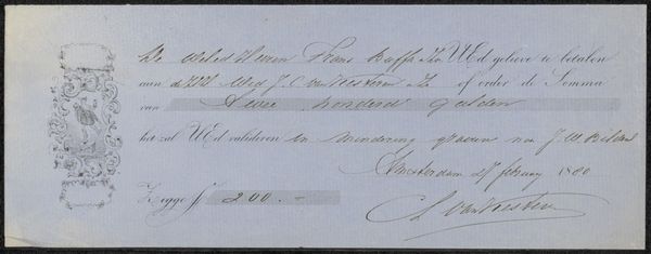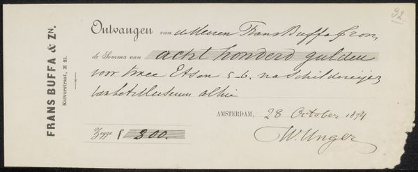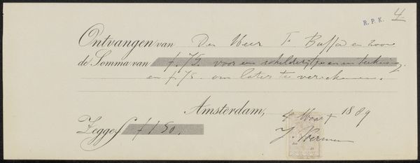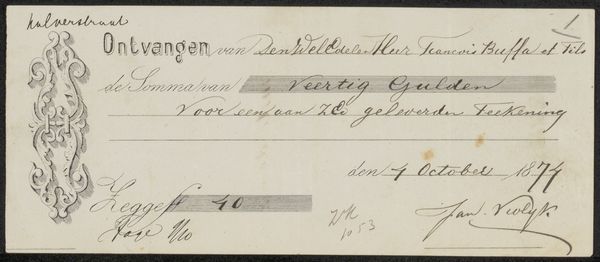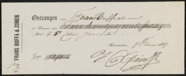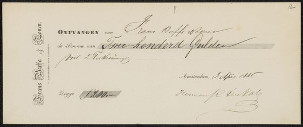 Curator: This elegant little scrap is titled "Kwitantie voor Willem Jodocus Mattheus Engelberts," likely created around 1863 by Frans Buffa en Zonen. It’s a receipt, meticulously rendered in ink on paper. It lives now in the Rijksmuseum’s collection. Editor: You know, my first thought is of ghosts and archives. All those swirling script and formalized phrases—it feels like whispering secrets from another time. It’s so delicate. Curator: Precisely! It’s more than just a record of a transaction. It's a performance. The graceful typography elevates it. Think about the context: Amsterdam, 1863. Buffa, a well-established name. There’s a certain power dynamic at play, a societal choreography embedded in the ink itself. Editor: Choreography, I like that. And look at the contrast, between the crisp, printed heading and the flourished hand lettering. It’s like two voices—the authority of the institution, then the personal touch. Almost intimate. Someone physically made this. Curator: Absolutely. The physical act of writing transformed information into a tangible object, giving even monetary transactions a sense of weight and presence. These records were a pillar of institutions and economies, solidifying relationships of debt, promise, and obligation. Think about who handled this, its importance for trade, and even political dynamics. Editor: Makes you think about where things are stored in our own society...servers tucked away who knows where...the cloud...all the important "documents" don't really exist! They float in digital space somewhere unknown. What will someone make of that someday, if we’re still around, that is. Curator: It's a beautiful reflection on the evolution of information and the tangible presence that the physical mark gave to human exchanges. I feel like, in it, we get a whole portrait of a past reality that a receipt doesn't convey anymore. Editor: Well said. Thanks, it’s made me think! Curator: Me too, thank you.