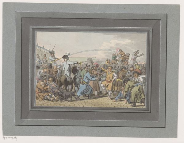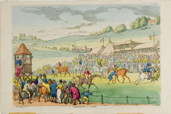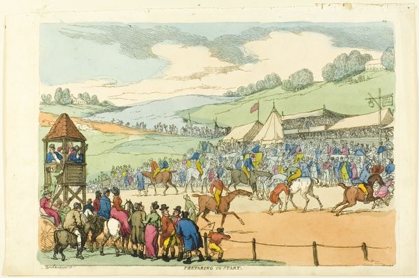 Thomas Rowlandson created 'Preparing to Start' using etching and aquatint, processes which rely on acid to bite into a metal plate and create an image. It’s then printed and hand-colored. These techniques, requiring specialized knowledge, were a key part of the print industry in Rowlandson's time. The image itself provides a snapshot of Georgian society at a horse race. The controlled lines of the etching allow for a detailed depiction of the crowd, grandstand and surrounding landscape. But it’s the aquatint and watercolor that really bring the scene to life, adding depth and vibrancy to the bustling scene. Prints like this were often made for a mass market. So, think about the labor involved, from the initial concept, to the skilled execution of the etching and aquatint processes, to the hand-coloring that would have been done assembly-line style. In understanding the layers of artistic production, we can better understand the world from which the artwork came.