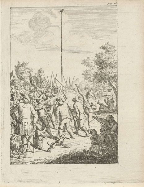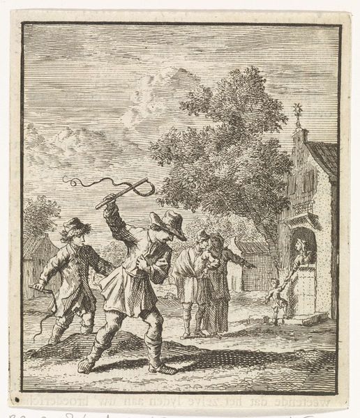 Simon Fokke created this print, “Fabel van de panter en de herders,” at an unknown date. The fable illustrates an encounter between shepherds and a panther. But what does this encounter really tell us? Prints like this, circulating in the 18th century, played a significant role in shaping societal views, embedding cultural norms and power dynamics. Here, we see a group of men united, armed, and ready to defend themselves against a wild animal, reinforcing a narrative of man versus nature, and implicitly, civilization versus the wild. The image speaks to the fear of the 'other' and the perceived need to control and dominate, ideas deeply entrenched in colonial narratives and the subjugation of marginalized communities. The act of stoning the panther is not just about self-preservation; it's about asserting dominance and maintaining a social hierarchy where the 'civilized' shepherd is superior to the 'wild' animal. This fable then becomes a lens through which we can examine the values and biases of 18th-century Dutch society. It prompts us to question the stories we tell ourselves about who we are, who we fear, and who we seek to control.
