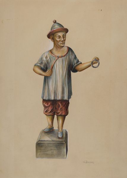 Curator: Good day. We’re here to examine “Iron Hitching Post,” a painting by George Constantine, circa 1940. The artist seems to have worked in tempera, perhaps also incorporating some drawing techniques. Editor: My first impression is one of stillness, almost a monumentality, despite its intimate scale. The figure's gaze is direct, almost confrontational, and the subdued palette contributes to a feeling of introspection. Curator: Indeed. There's a layered historical context to consider. While Constantine's "Iron Hitching Post" might appear straightforward, its realism flirts with Orientalism. Think about the implications: in the 1940s, images of people from non-Western cultures carried substantial political weight. How did such representations shape societal perceptions? Editor: That's interesting. You point to a deliberate construction, almost a stagecraft, which highlights a critical point: art doesn’t merely reflect reality, it actively shapes our understanding of the Other. Is Constantine commenting on Orientalist tropes, or complicit in them? Curator: It’s a fascinating tension, isn’t it? Let’s examine the symbol of the fan. Throughout history, fans served diverse purposes across many societies – from simple tools to combat the heat to status symbols. The man's stern expression seems to hint at suppressed agency, or perhaps cultural identity deliberately put on display. Editor: The work makes me consider the art market of the time. Academic art like this fed a specific collector base eager for images reflecting and reinforcing certain views of the world, views influenced by social, economic, and political agendas. The presentation almost renders the individual as an object—akin to the post. Curator: Right, this piece asks questions about appropriation, the commodification of cultural imagery, and the subtle yet potent influence of images in shaping social and political consciousness. Editor: I leave with more questions than answers, which speaks to its power. Curator: Agreed. A concise work that triggers complex reflections—a mirror on a bygone era, but still strikingly relevant to our contemporary gaze.