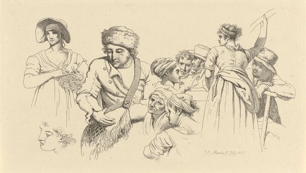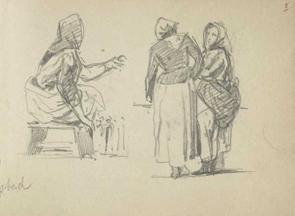 Curator: Let’s wander into the world captured by Rembrandt van Rijn in his pen drawing, "Beggar Man and Woman," from around 1630. Editor: I'm really struck by the… sketchiness, I guess. It feels so immediate, like a glimpse into a fleeting moment. What captures your attention in this piece? Curator: The quickness is it, isn’t it? Like eavesdropping on a conversation you’re not meant to hear. The vulnerability of the figures…almost unfinished but radiating a raw truth. The expressiveness with so few lines is astonishing. Editor: I see what you mean about raw truth. It feels like we’re peering into the real lives of these people. Was Rembrandt known for depicting everyday life? Curator: Absolutely. He found beauty and dignity in the ordinary. These weren't idealized portraits for wealthy patrons; they're character studies of real folk, pulsing with empathy. Does it spark a story for you, what they might be saying? Editor: Hmm, maybe she's pleading for help and he is listening to the offer? It does make you wonder what their story is. Curator: Exactly! Rembrandt plants those seeds of curiosity in our minds. We become storytellers, completing the narrative ourselves. I think that is the mark of his creative genius. It shows his deeply felt interest in other people. Editor: So true, it makes you really think and connect with it. I hadn’t thought about it that way. Curator: It’s a beautiful thing, isn’t it? To see a work that invites you not just to observe, but to participate. Editor: Definitely gave me a new lens to look through, for sure.
