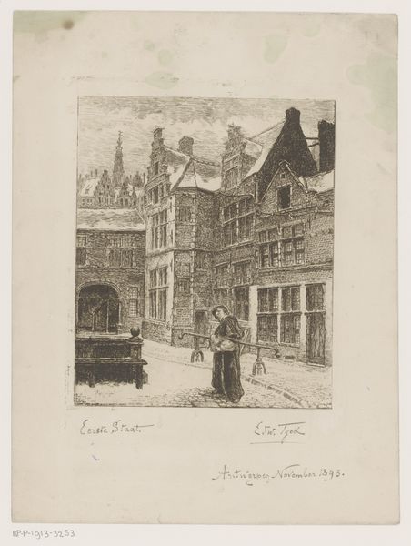 Octave Guillaume de Rochebrune made this print of the Château de Blois using etching, a printmaking technique steeped in tradition. The process begins with a metal plate, coated in a waxy, acid-resistant ground. The artist then scratches an image into this ground, exposing the metal beneath. When the plate is submerged in acid, the exposed lines are eaten away, creating grooves. Ink is then applied to the plate, filling these grooves, and the surface is wiped clean. Finally, the plate is pressed onto paper, transferring the inked image. The dense network of lines is built through labor, and suggests the history of craftsmanship in the depicted architecture. Etching enabled the wide distribution of images, fueling an appetite for picturesque views and historical landmarks, like this very courtyard. The labor of production mirrors the work of stonemasons, as the level of detail indicates a deep appreciation for architectural grandeur. By focusing on the materials and making of this print, we can see how traditional crafts intersect with commerce and culture, blurring the boundaries between art, production, and historical preservation.