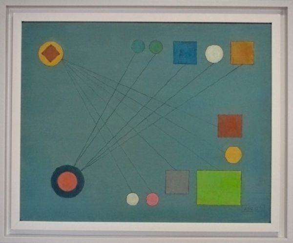 Curator: As you stand here, consider "Untitled," a 1956 mixed media creation by Lolo Soldevilla, a key figure in Cuban abstract art. Editor: It feels like looking at an architect's daydream! All those circles and lines... gives off a sense of elegant order, even if I don't know what it's ordering. Curator: Indeed! Soldevilla was part of a modernist wave emphasizing pure form and geometric precision, a revolt against more traditional, representational art forms. It seems the painting tries to make its viewers confront raw forms. Editor: Interesting. For me, the real tension comes from the colors. That stark contrast between the off-white shapes on the left and that series of small dots with different tonalities pointing towards the center to the right... what a play! What did this all *mean* to her? Curator: Well, Lolo did create artworks from a deeply personal, intuitive place... While others used similar forms for a technological feel, Lolo aimed at showing an intersection of inner worlds with this new vocabulary she explored. Her approach mirrors that of the Cuban art group Los Once (The Eleven), in its pursuit of sincere abstraction rooted in lived experiences. Editor: So it's not just about geometry, then? It’s more than the semiotics? It’s a journey of something deeply embedded into one’s core, with raw form as a mean! The longer I look, the more the forms soften... it does feel quite human, quite *vulnerable*, paradoxically. Curator: Precisely. While we dissect shapes and influences, let’s remember she left us a legacy—one of daring innovation but of deeply rooted feelings and meanings through geometry, something abstract expressionists wanted to find during that time! Editor: Thanks, I see that now; not sterile design, but raw, powerful sentiment cleverly disguised behind beautiful shapes. I will see form as deeply human now!