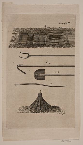 Curator: Looking at this print, it immediately brings to mind the silent elegance of scholarly pursuits. What's your take? Editor: The shapes all seem to echo the forms found in nature – from the curve of the "Cor ou Oliphant" to the lute’s rounded body. The engraving lends a somewhat austere charm, yet it teases with the idea of sound. Let’s delve in. Curator: This engraving by Jacques Louis Pérée, created sometime between 1795 and 1869, showcases musical instruments supposedly from the early 16th century, as noted by its title. I find it curious how the print presents these artifacts as relics. What readings can we provide for our audience? Editor: Consider how each instrument projects culturally ingrained images. The "Orgue portatif", or small organ, speaks of learned traditions within established churches. The flute and lute, on the other hand, carry folk melodies through centuries of oral and artistic traditions. Together, these objects form a landscape of early musical expressions. Curator: Yes, it seems the print tries to categorize different types of musical engagement within early European societies, the "high" church traditions versus secular, more communal forms. It’s fascinating how even the visual representation reinforces this cultural hierarchy. Editor: And the material itself adds a layer of significance, I think. Prints like this often functioned as educational tools, accessible across classes. It presents a sort of democratizing effect through the reproduction and dissemination of knowledge. Curator: Exactly! It is fascinating to see this piece within the framework of how knowledge and cultural appreciation were distributed, making music a subject of wider social discourse. Well, a sharp look and some sharp discussion! Editor: Indeed. It's quite compelling to visualize the harmony—and perhaps disharmony—that those early musical traditions might represent across various strata of society, each reverberating through history into our current museum context.