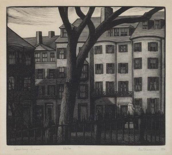 Editor: This etching is "City Lane" created by Armin Landeck in 1945. I am struck by its somber and deserted atmosphere. The geometric forms of the buildings are so imposing and create an almost claustrophobic feel. What do you make of Landeck's composition? Curator: The composition certainly asserts itself through stark contrasts. Notice the rigorous geometry, a clear departure from purely representational modes. The hatching and cross-hatching techniques create a complex interplay of light and shadow. Editor: Yes, the lines are fascinating! The level of detail creates a beautiful tonal range that really accentuates the structures, like the bare brick sectioning of some of the buildings. It is really quite skillful. How would you analyze Landeck's use of tone to create the spatial depth? Curator: It's more than skillful, it's controlled and precise. Look how the lighter tones highlight the planar surfaces catching the light, drawing the viewer's eye, whilst the darker areas suggest recession. The strategic application guides us through the urban architecture he depicts. Editor: So it's the juxtaposition of those different tonal values that construct depth through light and shadow? Is that why we see that looming recession down the lane? Curator: Precisely. The variations create volume and a sense of dimensionality that belies the print's two-dimensional nature. The very subtle graduation almost mimics the subtle shifting tones one might observe with photography. Note that the eye travels naturally, the composition almost an exercise in vanishing point perspective, subtly controlled and deployed. The work plays cleverly on geometry and tone, to offer a semi-abstracted picture of urban life. Editor: I see it now. The more you look at it, the more is revealed within his method. Thank you! Curator: Indeed, there is a deliberate order that underlies the aesthetic choice; it is an urbanity rooted in formalism, rather than the human condition.