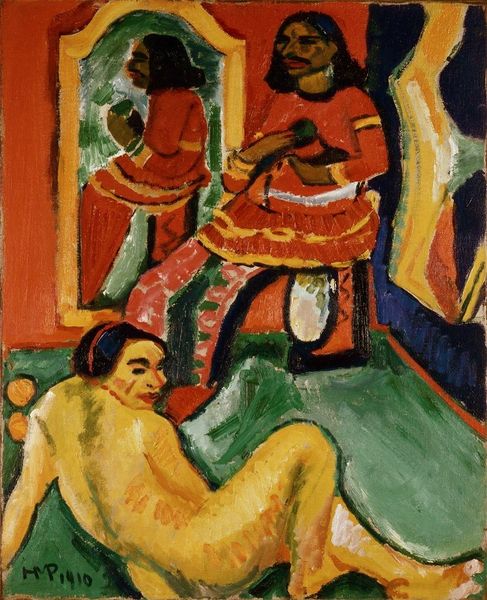 Editor: This is Ernst Ludwig Kirchner's "Nudes in Studio," painted in 1912 with oil on canvas. It strikes me as quite bold and raw, not conventionally beautiful. What do you see in this piece? Curator: It is raw, isn't it? Like a glimpse into a world vibrating with uneasy energy. Kirchner's expressionism often throws beauty out the window in favor of truth, or at least, *his* truth. It reminds me of sneaking into an abandoned theatre and seeing actors preparing. What do you notice about the colors? Editor: They're definitely jarring! Lots of clashing reds and blues... it’s not harmonious at all. Curator: Precisely. This discord reflects the anxieties brewing in pre-war Germany. Kirchner and the Die Brücke artists were rebelling against academic traditions, seeking a more authentic representation of modern experience – and I can't help thinking, "Was this work ever truly *finished*? Editor: Anxious, yes. Almost as if it were left unfinished. Does the style reflect any historical or societal shift from that period? Curator: Absolutely. There was a growing sense of unease and alienation. This translated into jagged lines, distorted figures, and intense colors, as if they’re ripping open the polite facade of society to reveal the primal emotions beneath. Imagine the stuffy salons of the time – this painting would have been a scandal! Editor: It is! So it's less about idealizing beauty and more about capturing… truth? Curator: Or perhaps a truth. It's Kirchner's deeply personal interpretation. To me, it's a visceral cry against complacency. It’s confrontational – were all our interpretations right? It doesn't settle neatly. Editor: Thanks, that makes perfect sense, especially seeing it as his emotional reaction to the moment. That certainly adds another layer to appreciating what Kirchner was trying to convey. Curator: Right? Each time, for each viewer, the work continues to morph, and yet its origin never disappears. A magic mirror.
