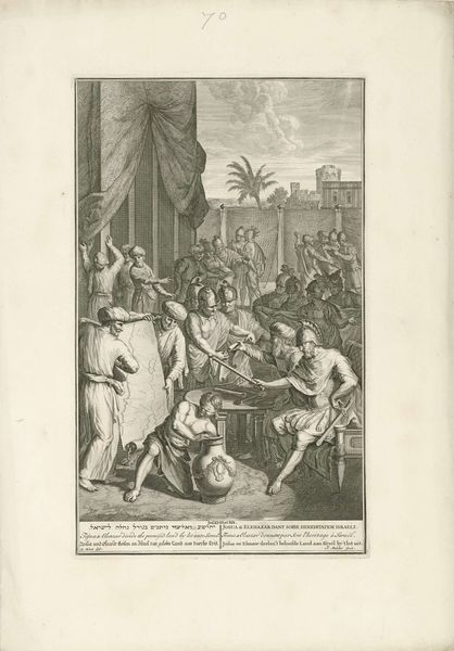Curator: Welcome to the Rijksmuseum. Here, we have Gilliam van der Gouwen's engraving from 1728, titled "Jephthah Welcomed by his Daughter." It depicts a scene from the Old Testament. Editor: It's a rather somber tableau. The stark contrast in the engraving gives it a dramatic flair, and the way all figures gravitate around that central female figure. What are your thoughts? Curator: The artwork presents a complex narrative around patriarchal bargains and national duty. Jephthah, a judge of Israel, made a vow to sacrifice whatever first came out of his house to greet him if God granted him victory in battle. As fate would have it, it was his daughter. Editor: You immediately understand this deep-seated fear. It’s a scene steeped in the weight of impossible choices. The almost theatrical expressions—the women in shock, Jephthah covering his face, are telling of a symbolic gesture that continues to resonate. It raises questions about power, gender roles, and the implications of one's commitment. Curator: Precisely! The depiction raises ethical questions and exposes gendered expectations placed on women to passively accept their fates for the greater good. Consider how similar themes around female sacrifice permeate literature, culture, and art, revealing deep seated structural issues. Editor: Absolutely. The image carries the symbolism of sacrifice and promise. It’s interesting that even in this formal, almost stylized Baroque setting, the emotional undercurrent feels raw. And look closely – the image is filled with hands! From Jephthah’s covered face to his daughter’s welcoming stance, these hands gesture feelings that give visual insight into hidden aspects of cultural trauma. Curator: A relevant and necessary reading in today's global context, especially in conflicts where nationalist narratives are intertwined with religious zeal. It urges critical examination of the socio-political forces acting upon people's lives, then and now. Editor: An etching, perhaps of an age long past, still capable of cutting to the core of complex historical themes—very evocative, even to contemporary minds.