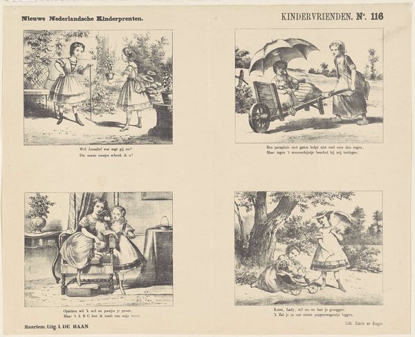 Curator: This is “Jachtavonturen,” or "Hunting Adventures," a print made by Jan de Haan sometime between 1875 and 1903. What do you make of it? Editor: Oh, my. A cascade of colonialism served on a single page! Four little scenes, each a miniature drama of man versus beast in far-flung corners of the world. There’s a roughness to the print, a directness... are these meant for children? Curator: They are indeed. Part of a series of "New Dutch Children's Prints". So, mass produced, intended for wide distribution and consumption, hence the fairly simple, bold lines and use of color. Note also the textual captions below each image – reinforcing the narratives presented visually. Editor: It feels morally dubious now, of course. But I see how it reflects a worldview, or rather, an ideology. The drama's laid on thick; the illustrations give the impression of the thrilling "conquest" of wild animals as this sort of global civilizing mission. It seems to present encounters not as desperate struggles but assured victories. Curator: Exactly. The focus on the materials reinforces the social and economic structures supporting such a perspective. Paper, ink, and the printing process itself depended on industries deeply intertwined with resource extraction and colonial trade routes. Even the depiction of these "exotic" animals highlights a European fascination with the natural world as something to be cataloged, possessed, and controlled. Editor: I wonder about the impact on children. Did they read it differently, perhaps projecting their own innocent narratives onto these little dramas? Or was it really this successful at instilling a sense of cultural superiority from such a young age? Curator: It’s impossible to know for sure, but prints like these undeniably shaped the worldview of children at the time, subtly normalizing hierarchies of power and celebrating a certain brand of colonial adventure. It shows how materials can bear powerful ideological messages and shape social understanding. Editor: I'm left wondering if there’s a modern analogue—something as seemingly innocuous carrying such potent cultural baggage. Thanks for illuminating these layers. Curator: My pleasure. Analyzing "Jachtavonturen" brings the colonial implications of its production sharply into focus.
