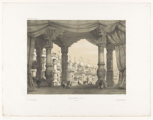 Curator: This engraving from sometime between 1854 and 1858 by Eugène Cicéri is titled, "Theaterdecor voor de eerste acte van het stuk Zerline (of La corbeille d'oranges)." It depicts a bustling marketplace scene, likely the set design for an opera's first act. What stands out to you initially? Editor: The light. It's filtered and theatrical, even though the scene suggests reality. Those layers of veiled illumination add an otherworldly tone to something that’s supposed to represent a daily event like a market. It suggests a deeper, symbolic narrative unfolding beneath the surface. Curator: And the making of this print underscores the performative. We should notice how the layering of the engraving upon an earlier watercolor gives real depth and texture to this urban prospect. That superimposition mimics the many strata of stagecraft – costume, set, lighting—contriving to fashion a fleeting illusion of Baroque city life, that in the end, reduces to mere ephemeral entertainment. Editor: That's fascinating! Speaking of Baroque, there’s that church dome barely visible in the distance. It acts as a cultural anchor, maybe connecting the fictional stage world with grander concepts of spirituality and enduring civic virtue. Perhaps it hints at something greater being at stake for the opera’s characters? Curator: Possibly. Although this print, like many produced for theater, was less about grand concepts and more about the consumable spectacle. Prints like these acted as marketing tools to entice middle-class audiences by emphasizing lavish spectacle. Editor: Well, you can definitely see the spectacle. Even details like the vendors, with their wares meticulously displayed under small umbrellas, it all contributes to a dense and rather persuasive image. But tell me, does that drama, or the labor behind constructing that drama, register on a more conceptual level? Is there any critique of these representations? Curator: The work, fundamentally commercial and reproductive, does not invite such conceptual meditations on the social apparatus. By design, it reinforces consumer desires through crafted, digestible experiences. The image normalizes a kind of theatricality as a desired, upper-middle class good. Editor: That is an unexpectedly cynical but clarifying perspective. In that case, I will remember this elaborate scene as a cultural artifact, a little world meant not just to be looked at but to be felt. It provides such insight into the power of symbols to not only entertain but to define collective hopes and dreams. Curator: Precisely, by examining the artwork’s production and how it circulated, we glean insight into the machinery of cultural value back then.