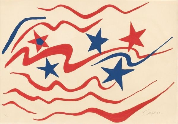 Curator: As we move along, our next stop brings us face-to-face with Roy Lichtenstein’s “Forms in Space,” a mixed-media print from 1985. Editor: Whoa. At first glance, I feel like I'm looking at a very stylish, slightly seasick version of the American flag. Curator: Indeed! Lichtenstein playfully engages with quintessential American symbols. He appropriates these popular, readily available images to make his own statement, abstracting the flag into something... different. Editor: And it's the patterns! The polka dots replacing stars, and those stripes at a jaunty angle. It feels… off-kilter. There is also this strange contrast between the regularity of the circles and the movement created by the lines. What could be behind the visual tricks? Curator: In iconography, circles often represent wholeness and unity. But Lichtenstein disrupts this. It could be a critique of homogenized patriotism, maybe even a playful commentary on how we consume images, especially in popular culture. And regarding the angled stripes, perhaps a visual pun reflecting a distorted or biased perspective? Editor: You know, it almost feels like a funhouse mirror version of national pride. The vibrant red, white, and blue are there, but twisted. This provokes some thoughts around the theme of identity, but in a somewhat ironical and mischievous way. I see pop art subversion! Curator: Absolutely. It forces us to consider how familiar symbols can be manipulated and reinterpreted. And how these symbols contribute to collective memory and identity, often unconsciously. He turns the familiar strange, asking us to look beyond the surface of ingrained national narratives. Editor: So, it is like Lichtenstein is inviting us to deconstruct our cultural wallpaper. He is poking at something deeply ingrained in our collective psyche, making us question the readily accepted icons that shape our understanding of America. Not bad! Curator: Precisely! He challenges us to reconsider the power of symbols and the narratives they carry. It’s a testament to art’s ability to prompt critical thought about our own cultural inheritance. Editor: Well, after examining Lichtenstein's skewed stripes and playful dots, my understanding of cultural representation in the visual landscape feels, fittingly, altered! Curator: Mine as well, and isn't it brilliant to explore the symbols shaping our shared memories and perceptions of belonging?