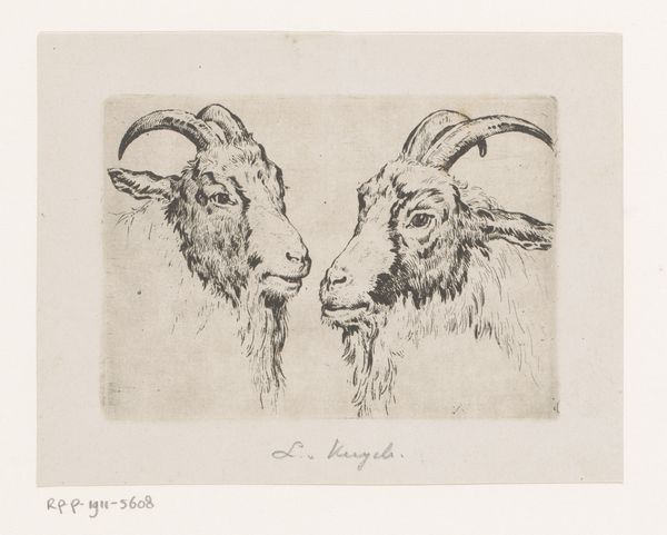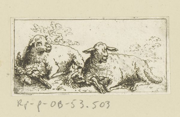 Editor: This is "Drie geiten" or "Three Goats" by Christian Wilhelm Ernst Dietrich, created in 1742. It's an etching and engraving. I'm struck by how raw the depiction is. What draws your attention in this piece? Curator: Immediately, I think of the material process. Etching and engraving weren't simply methods of artistic expression; they were industrial practices. How does Dietrich, by utilizing these printing techniques usually reserved for mass production, elevate or perhaps subvert our traditional notions of fine art? Editor: That’s a great question. I never really considered the printmaking process itself as having that kind of social context. Curator: Think about the socio-economic forces at play. Who commissioned these prints? Who could afford them? Were they destined for the walls of wealthy patrons, or circulated amongst a broader, less affluent audience? Also, observe how the textures created in the rendering of the goat's hair. What tools were used to get such effects, and what sort of labor was required? Editor: So, rather than just focusing on the image itself, you're prompting us to consider the entire network of production and consumption surrounding this etching. The print's very existence becomes a statement about artistic labor and distribution. Curator: Precisely! We shouldn’t separate this ‘genre-painting’ from its means of production. This little image encourages a broader thinking about art's position within society, its accessibility, and the role of the artist as not just a creator, but also as a producer. Editor: I’ll definitely look at prints differently from now on, understanding them not just as images, but also as artifacts of a particular social and economic moment. Curator: Exactly. Looking closely at its production allows a closer inspection of a cultural context of 18th-century artistic production.