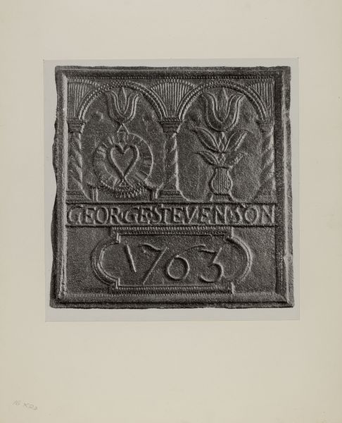 Editor: So, this is a Pa. German Stove Plate, probably ceramic and metal. It’s dated around 1936 and described as relief print folk art. It looks really weathered and old. What do you see in it? Curator: This stove plate is fascinating. The symbols themselves become a kind of cultural record. The relief carvings are deeply symbolic, aren’t they? Notice the date – 1753 – it refers to a past generation imprinting themselves on the present through durable art. Consider the wear and tear; that is, time inscribed onto this material. Editor: So, you’re saying the symbols themselves tell a story that goes beyond just decoration? Curator: Precisely. Look at the motifs, perhaps floral or heraldic. Each likely held significance in 18th century Pennsylvania German culture, reflecting beliefs, values, and perhaps even family history. The choice to depict them would have been quite deliberate. What emotions do they stir in you? Editor: Well, I didn’t think about it like that at first; it's aged, obviously, but to consider all the time held *within* the material... I am moved to reflect on the individuals connected to this art. Their labor and its legacy, all presented here in metal. It's a very grounded art object. Curator: Exactly. Even the material itself, this mix of metal and ceramic, points to practicality and artistry combined. It embodies that period, a convergence of needs and creativity. And the 'print' element tells us it may have been a modular or even mass-produced design for many homes, which speaks to wider communal meanings. What would that have felt like? Editor: It really makes me wonder about the stories this stove plate could tell. Thank you for making me reconsider its emotional and cultural dimensions. Curator: It’s been my pleasure. Hopefully, thinking about images and time in such direct ways will inform how you explore all art going forward.