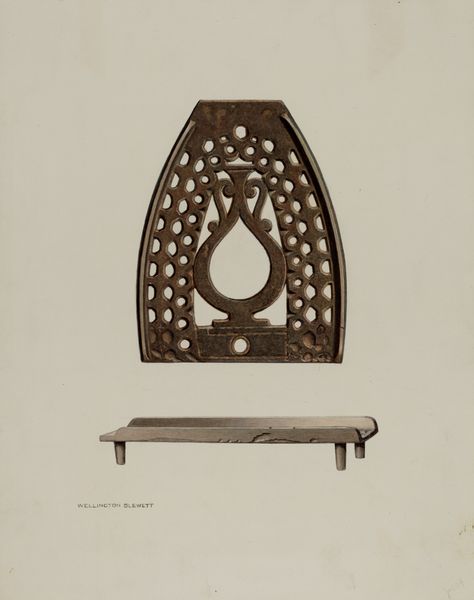 Curator: Before us is Milton Bevier's 1939 pencil drawing, "Trivet". Two views are presented: one, a straightforward elevation; the other, an oblique view lending depth. Editor: It strikes me as strangely beautiful, in its simplicity. There’s something about rendering this functional object with such care. The old engraving style gives it a certain dignity, doesn't it? Curator: Indeed. Note the precision in line work, and how the shading expertly delineates form and texture. The subtle tonality of the paper harmonizes perfectly with the medium. Observe the compositional elements—the way the two views interact creates a visual rhythm. Editor: I am compelled by how this work elevates an everyday tool, almost a relic of a past industrial landscape. The Colebrookdale Iron Company, once vital, now captured only in these ghostly pencil lines on toned paper. Consider the labor involved in both the manufacture of the trivet and this rendering of it. It really begs questions about the value we assign to objects and skills. Curator: Precisely, Bevier guides us to consider utilitarian objects with newfound contemplation. See how the choice of medium emphasizes delicacy? The artist is experimenting with shading techniques. It appears quite calculated. Editor: Yet there’s also a trace of the hand, a slight sketchiness. What stories do you think such items tell? Perhaps someone was employed in this type of industry in their own local community. These could easily have personal and poignant meanings beyond the aesthetic appeal of a composition. Curator: I'm convinced Bevier appreciated the beauty in its austere practicality. The cross emblem is clearly a formal feature. And so it invites contemplation about form itself and the nature of our perceptions. Editor: The fact it's drawn rather than, say, photographed also introduces distance, lending it a sort of antique character even when originally drawn in 1939. So, by depicting everyday things this way, we start considering labour, design, utility, but all viewed through an aesthetic sensibility. Curator: A most rewarding way to conclude our insights today. Editor: It really gives a feeling for how artistic intention and cultural artifacts intersect in time.