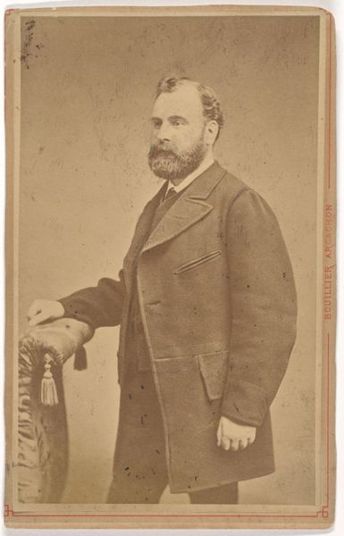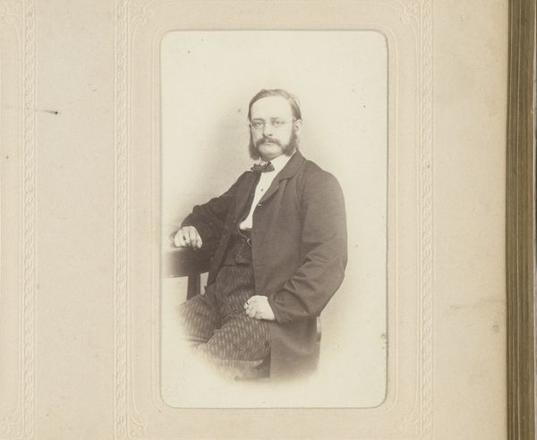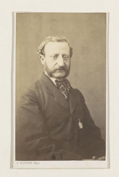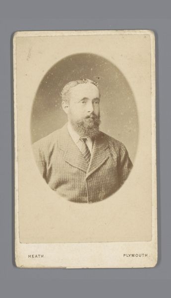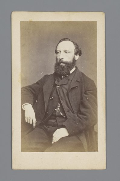 This sepia photograph captures an unknown man at a table and was created by Joh. Eschricht. The composition is simple and direct: the man, seated, faces us, filling the frame with his presence. The photograph's strength lies in its subtle gradations of tone and texture. Light catches the contours of his face and beard, lending a sculptural quality to his features, while the dark suit contrasts with the lighter tones of his shirt and waistcoat. We can read this contrast as a play between concealment and revelation. The man’s gaze is steady and direct, inviting the viewer to contemplate his character. The formal arrangement of the portrait, with its emphasis on symmetry and balance, reflects an interest in the ordering of visual elements to convey a sense of stability and composure. Note how the interplay of light and shadow, the arrangement of forms, and the gaze all work together, creating a cohesive and engaging whole.