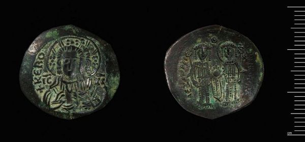 Editor: Here we have the "Coin of Manuel I" from the Harvard Art Museums. It's quite small, but I'm curious about its intricate details. What can you tell me about it? Curator: This coin, though diminutive, speaks volumes about power and representation. Consider the image of the emperor, likely Manuel I, placed alongside religious symbols. How does this juxtaposition legitimize his rule? And what does it tell us about the Byzantine Empire’s self-image? Editor: So, it's about blending religious authority with political power? Curator: Exactly! It's also interesting to examine how the coin itself, as a medium of exchange, circulated these ideas of imperial authority throughout the empire and beyond, shaping perceptions of Manuel I's reign. Fascinating, isn't it? Editor: Definitely. I hadn't considered the coin's role in disseminating power structures.