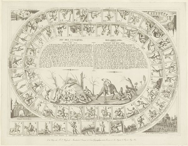 Editor: This charming lithograph, “Het nieuw vermakelijk ganzenspel / Le nouveau jeu d'oie,” by Glenisson & Van Genechten, dates to the mid-19th century. It's actually a board game! It’s visually quite intriguing with the geese circling the edge. As a historian, what’s your take on this as a piece of cultural history? Curator: It’s fascinating! Board games are a fantastic lens through which to view social dynamics and popular culture. Considering that it dates back to the mid-19th century, do you notice any clues about the dominant ideology being presented through game format? Editor: Well, the game pieces seem to show aspects of everyday life – a forge, a tavern… common settings for ordinary folks, perhaps? Curator: Exactly. And the fact that it's a game about geese. Consider the role of the goose within popular visual culture at this time, perhaps symbolic of certain kind of foolishness? How might that have resonated with contemporary audiences? Editor: I hadn't considered the geese as possibly more symbolic! Does the inclusion of text in both Dutch and French hint at the social status or geographic relevance? Curator: Absolutely! The bilingual text suggests a target audience in a region with both Dutch- and French-speaking populations, perhaps indicating political factors or a desire for wider accessibility. It's indicative of a specific cultural and socio-political environment, where language and commerce were intertwined. What does it suggest about its possible location and status as an appealing social opportunity to its players? Editor: It definitely provides insights beyond just leisure; it shows accessibility and societal values, presented cleverly in this decorative game. Curator: Precisely! We see not only a game, but a tiny window into the past and it teaches how popular art shapes society's norms.