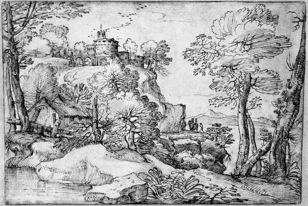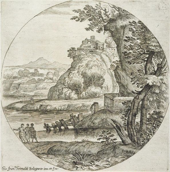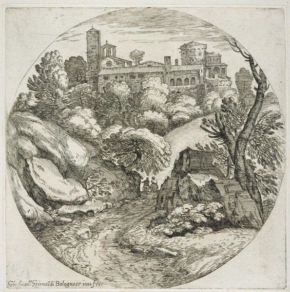 Curator: Giovanni Francesco Grimaldi's "Landscape with a Man Crawling" presents us with a detailed scene rendered in delicate lines. Editor: There's a striking contrast in scale, isn't there? The architecture looms in the background, while the figure seems almost overwhelmed by the landscape. Curator: Absolutely. This work at the Harvard Art Museums, crafted in etching, speaks to the role of the printmaker within 17th century landscape production. The man crawling invites questions about labor, social mobility, and perhaps the artist's own position as a creator. Editor: The composition is captivating, with the oval format framing a complex interplay of architectural forms, natural elements, and of course, the figure. How does the man relate to everything in the picture? Curator: Maybe he's simply part of the pastoral scene, or perhaps he represents a kind of societal struggle – reaching for something just beyond his grasp. The etching process itself, layering thin lines, mirrors this very act of striving. Editor: It's a curious, somewhat melancholy scene. The crisp lines enhance the dreamlike quality of the piece. Curator: Indeed. A small piece, but full of intriguing questions about how we construct our world, both literally and figuratively.
