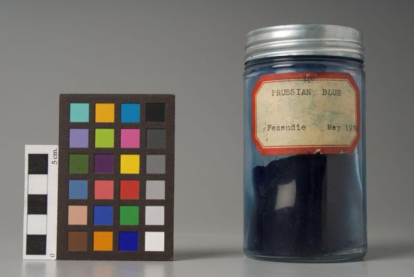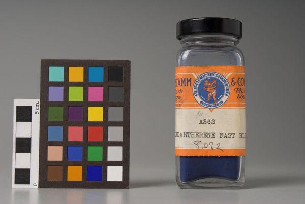 Curator: A bottle of pure pigment…it’s just so intensely blue, isn't it? Editor: It is. This "Ultramarine Blue," manufactured by Fezandie & Sperrle, encapsulates so much history of color production. I'm struck by how a color can be an object, a commodity. Curator: Absolutely, it's like holding a piece of the sky. A captured dream. I wonder what artworks this particular pigment went on to create? What masterpieces now house bits of this blue? Editor: Well, originally, ultramarine was derived from lapis lazuli, so the synthetic version democratized access to this precious, deeply symbolic color. It speaks to industry, innovation, and access. Curator: That little star sticker makes it feel accessible and almost playful. It connects it to the artist's studio, to the creative process, and dreams waiting to be realized. Editor: Yes, it's a reminder that even raw materials have their own story, a journey from factory to artist. I really wonder about the manufacturing process. Curator: I'm just lost in the endless depths of that blue.