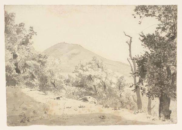 Editor: So, here we have Thomas Stothard's watercolor, "Coast Scene: Hill Landscape." It feels very much like a pastoral scene, but quite subdued. What do you read into this landscape? Curator: Stothard was creating this work during a period of great upheaval in England. While seemingly tranquil, landscapes like this served to reinforce ideas about national identity and stability amid rapid social and political change. Consider who might have been purchasing and viewing such images. Editor: So, it's not just a pretty picture, but also speaks to the anxieties of the time? Curator: Precisely. The popularity of such scenes can be interpreted as a yearning for an idealized past, a visual counterpoint to the industrial revolution. Editor: I never thought of landscapes being political statements. It gives a whole new depth to them. Curator: Indeed. Art often reflects and shapes our understanding of the world around us.