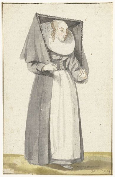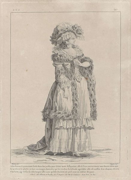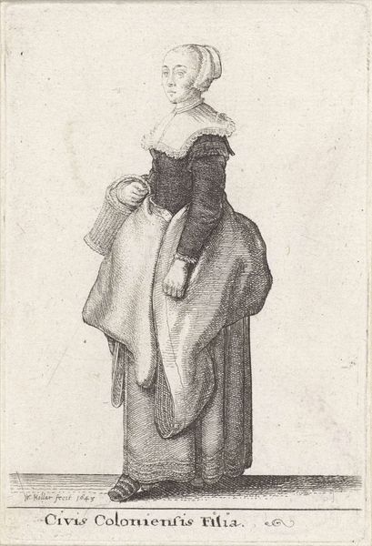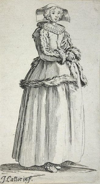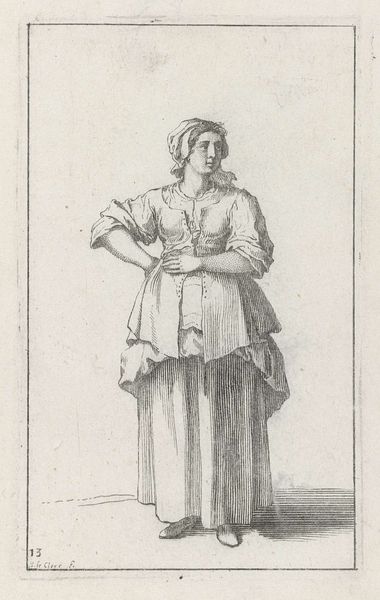 Curator: Before us is "Standing Women," an intriguing print from the Harvard Art Museums, crafted by an anonymous artist. The clean lines and delicate details immediately strike me. Editor: There's something stark about it, almost like a fashion plate, but with a seriousness. I'm curious about the fabric; the way the apron is rendered suggests a coarse linen. Curator: Indeed, the choice of clothing speaks volumes about social standing and profession. The artist's focus on costume reflects the era's concerns with identity and status. Editor: And the etched lines emphasizing texture, perhaps hinting at the labor involved in producing these garments. Someone spun, wove, and stitched this. Curator: Precisely! This print provides a fascinating glimpse into the lives of women and the visual culture that shaped perceptions of them. Editor: Ultimately, it reminds us to consider not just the image, but the hands that made both the art and the textiles it depicts.