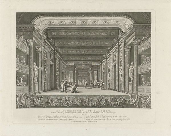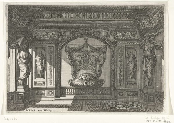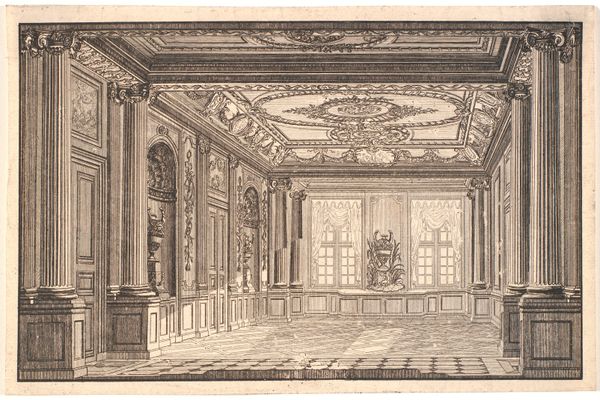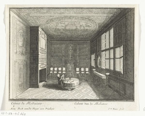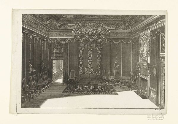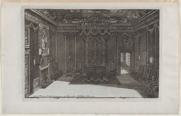 Curator: This is Bernard Picart's "Interieur van het Cabinet de l'Amour in het Hôtel Lambert" from 1740, an engraving housed in the Rijksmuseum. It depicts a highly ornamented interior, but it's all in grayscale. Editor: It's amazing how much detail he captured with just line work! It feels almost photographic. How do you even begin to interpret such a dense piece? Curator: Well, I start with the means of production. Engraving, in Picart's time, was a highly skilled craft, tied to print culture and dissemination of ideas. Think about the labour involved in creating these intricate lines. And who was meant to consume this image? Editor: Presumably, other wealthy patrons or perhaps aspiring artists looking for inspiration? Curator: Exactly. The Hôtel Lambert itself was a symbol of wealth and power. The "Cabinet de l'Amour" suggests a space for private, perhaps even licentious, aristocratic life. The print then becomes a commodity, extending the reach of that power, reproducing and consuming it. Notice how the ornament nearly suffocates the space. Editor: That's a fascinating perspective. It makes me think about the value assigned to different forms of labor and how printing allowed access to a world only some could experience. Were there workshops of engravers creating this? How does his process relate to the subject of the elite’s indulgences? Curator: That’s precisely the link. Picart's workshop probably employed multiple assistants to expedite this process. He's not just documenting, he's also participating in the system of production and consumption he depicts. It really underscores the materiality and labor that uphold this illusion of opulent leisure. Editor: That is a new insight to this work of art! I always viewed artworks with a beautiful appearance, but now I see it also as evidence of social class and hard work. Curator: Precisely! Focusing on the material aspects reveals much more than just aesthetic beauty.