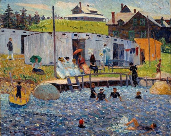 Editor: Here we have Maurice Prendergast's "The East River," painted in 1901. The watercolor and graphite feel very light and airy, almost like a hazy memory of a summer day. The scene is teeming with children at play, with the industrial backdrop of the East River just beyond. What do you see in this piece? Curator: Oh, isn't it just delightful? Prendergast's work always gives me this sense of spontaneous joy, like stumbling upon a hidden world of innocent mischief. I see a celebration of urban life, a vibrant dance between childhood and the gritty reality of industry. It's like he's captured the very soul of a bustling city moment. And the way he layers the watercolor… does it remind you of confetti caught in a gentle breeze? Editor: I hadn't thought of confetti, but I see it now! The colors do have that scattered, festive feel. Do you think there's a commentary on the industrialization happening at the time? It seems to be almost hidden behind the carefree figures. Curator: Perhaps, but with Prendergast, it's never quite didactic, is it? More like a quiet observation, a juxtaposition. He's not condemning or praising; he's simply showing us the coexistence. Look at how the smokestacks mirror the children, reaching upwards with an almost childlike enthusiasm, as if the city itself is a playful giant. It is a poignant commentary indeed. Editor: That’s a really interesting point – seeing the smokestacks as playful rather than ominous! I definitely have a different perspective now. Curator: Art is a kaleidoscope; always another facet to explore! I find that Prendergast's works remind me to discover magic in the mundane; don't you agree? Editor: Absolutely! Thank you!