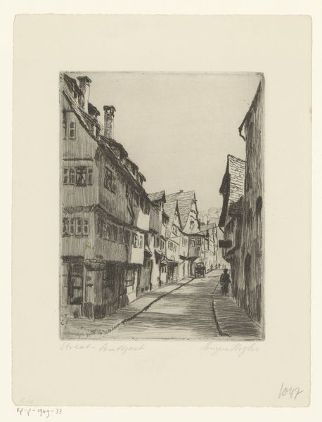 Curator: Here we have "Gezicht op een huis in de rue du Cloître des Bernardins in Parijs," a print made sometime between 1850 and 1940, by Gabrielle-Marie Niel. It's an etching, offering us a glimpse into a Parisian cityscape. What strikes you about it? Editor: Immediately, the intricate lines draw me in, creating a world that feels both intimate and immense. It's a bit like peeking through a keyhole into a forgotten time, all grey and cobblestone, a gentle sadness almost, wouldn’t you say? Curator: Absolutely. Niel's work captures a moment in Parisian history, reflecting both the Realist movement's focus on everyday life and the emerging interest in Impressionism's ephemeral qualities. The choice to depict a residential street, rather than a grand boulevard, suggests a deliberate interest in the unvarnished reality of the city. The subject reflects an early focus on urbanization in art history and a shift away from idealized representations. Editor: And the rooftops, jumbled and stacked – they remind me of my own messy thought process, all different heights and angles, connected somehow. There's something about the way the light fades, almost like a stage set… where the stories linger even after the actors leave. I wonder about the figures barely visible in the street, mere shadows in the scene. Curator: Those subtle details provide a window into the city's social fabric. Niel’s work comes at a moment when Paris, through extensive redevelopment, became the center for art production. The muted tones emphasize the density of the neighborhood, suggesting the challenges and intimacies of urban life at the time. It is possible this also alludes to displacement through modernization, showing an environment being changed due to policy. Editor: It feels intensely personal. Like Niel wasn't just documenting a place, but sharing a feeling. That melancholy light almost washes the scene clean of grandeur. Almost like grief, hanging in the air like the chimney smoke. What do you take away from it? Curator: It prompts reflection on the city's evolution, the relationship between art and social change, and the way that urban environments reflect our collective memory. The details also speak of a moment caught mid-transformation in the French capital, with both old buildings and modernity juxtaposed for the viewer. Editor: For me, it's about those untold narratives nestled between the rooftops, those unseen faces walking through the archway… the sheer beauty in quiet observation. And it certainly makes me want to revisit Paris soon!