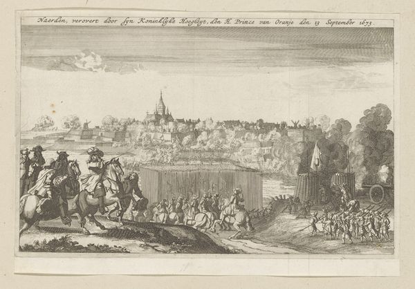 Curator: What strikes me immediately about this engraving is the sheer busyness of the scene, all these figures meticulously rendered despite the small scale. It almost vibrates with energy. Editor: Indeed. We're looking at "The Entry of Prince William III into London, 1688," created in 1691. It's a print that captures a pivotal moment in British history, produced shortly after the event itself. Curator: History-painting. It’s tempting to frame William's arrival purely as a liberatory intervention—ousting James II and ushering in a new era, but can we disentangle that triumphant narrative from its exclusionary effects, particularly the ongoing colonial project connected with Dutch and English imperialism? Editor: Absolutely. These prints served as potent visual propaganda. The Glorious Revolution and William’s role were actively shaped and disseminated through images like this, influencing public opinion. Curator: The artist emphasizes pageantry and order. Lines of soldiers and masses of spectators form neat edges with architectural landmarks; perhaps to suggest the inevitability of this changing power dynamic. The composition itself normalizes power. Editor: The print’s linear style, very typical of baroque engravings, communicates that perceived sense of order very directly, doesn't it? Note how the landscape becomes a stage for political theater, serving almost as a backdrop to emphasize the procession. Curator: Which begs the question: for whom was this spectacle intended? How did people of different classes and identities understand or participate in these displays of power? Surely women's presence looks… staged. Editor: These were, of course, very deliberately constructed events. Images like this engraving reinforced that deliberate construction but also played an essential part in wider civic memory. Curator: Thank you, it helps me understand the purpose of this depiction. It makes me wonder, however, what it might have suppressed or sidelined? Editor: Indeed, analyzing who controls imagery and shapes its message becomes vital if we hope to form a comprehensive understanding.