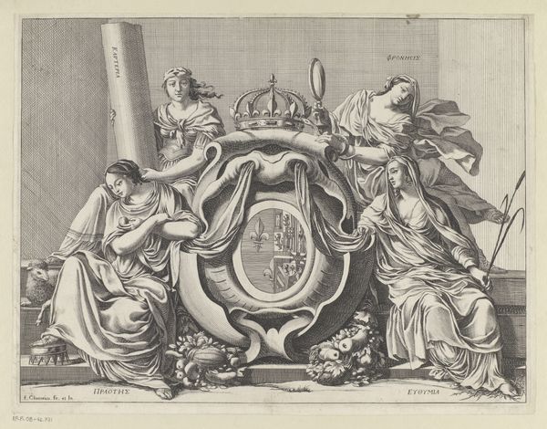 This engraving, "Mars en Luna naast een helm met kat," was created by Claude Mellan. The composition is structured around the central heraldic shield, flanked by Mars and Luna, rendered with precise lines that define form and texture. Mellan uses the stark contrast of light and shadow, achieved through fine, parallel hatching, to articulate the figures and objects. Note how the bodies of the figures are given form by a multitude of fine lines. This technique is central to understanding the image, as it reflects a shift towards valuing the precision of engraving as a medium capable of rendering complex scenes with clarity and detail. The cat perched atop the helmet adds a layer of symbolic complexity, potentially disrupting traditional interpretations of heraldic imagery. Mellan's engraving invites ongoing re-interpretation, highlighting how form can challenge conventional meanings.