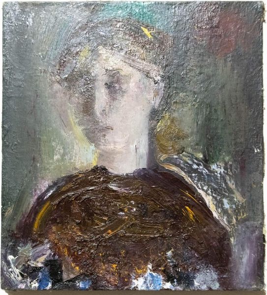 Curator: Up next, we have “Flower Hat,” an expressive oil painting by Ligia Macovei. There isn't a confirmed date, but let's dive into it anyway! Editor: Immediately, I’m struck by the gaze. She seems almost... burdened by the weight of beauty. Or is it just me projecting again? Curator: Not at all. I feel that weight too, maybe in the impasto—those thick, almost sculptural brushstrokes around the hat. All those symbolic flowers… almost like a halo, yet there’s a raw energy fighting with any sense of piety. What do you think that juxtaposition conveys? Editor: Flowers traditionally signal things like innocence, or purity, or beauty, but they can also be reminders of life’s brevity, right? Maybe that’s the conflict. It is like she is carrying the expectation of perpetual bloom on her head, and she knows it can't last. The sadness comes from that awareness. The slight downturn of her lips only seems to accentuate this further. Curator: The artist must be keenly aware of this inherent contradiction, it speaks to the ephemeral nature of these blooms. And you are right about the lips, such subtle melancholy captured with simple means! It's this emotional honesty, so viscerally rendered, that pulls me into the work. Also the cool background helps bring the character to life, by allowing her features to breathe in the artwork. Editor: And those colors chosen for the hat – bright but bordering on fading somehow! I read a certain resignation too; not defeated, but realistic. Perhaps the painting symbolizes someone wise in the hidden language of gardens. Curator: A kind of secret wisdom expressed through the universal symbols of nature... I appreciate how Ligia makes us confront the fleeting nature of everything that blossoms in life. A subtle reminder indeed. Editor: Exactly! A silent sermon about the paradoxes we carry in our human experience, bundled with roses and thorns.