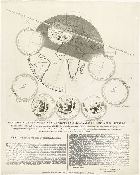 Curator: Editor: I'm excited to discuss this engraving by Emanuel Bowen from 1733. It's called "Prent van een mechanisch model van het zonnestelsel met uitleg van de beginselen van de astronomie"—quite a mouthful, but it translates to "Print of a mechanical model of the solar system with an explanation of the principles of astronomy." At first glance, I am drawn to its highly structured, almost architectural feel. What do you see in it? Curator: From a formalist perspective, the interplay between text and image creates a fascinating tension. Observe how the central orrery model, a visually striking geometric form, is both visually dominant and structurally integral to the surrounding blocks of text. Do you notice the density of line work defining the sphere? The image adheres to a clear hierarchical structure where each element maintains precise visual articulation of scientific rationalism. Editor: Yes, I can see that! So it's not just about what's depicted, but how it's depicted? The balance of the imagery with text helps to shape a reading of scientific exactitude. Curator: Precisely! The arrangement on the paper also guides our eye, encouraging a systematic engagement with the presented principles. Further, note the use of engraving—a medium that lends itself to exacting detail. Consider what philosophical ideas it conveys! Editor: It presents scientific principles with authority and exactness. This exploration definitely goes beyond simply understanding the depicted subject matter! It reveals to me the intellectual intention through visual language and its own formal structure. Curator: Exactly! It demonstrates a rational worldview reflected in a measured deployment of form and medium, shaping knowledge through compositional strategies. Editor: Thanks. It’s fascinating how paying close attention to visual qualities and philosophical ideas can offer new levels of understanding.