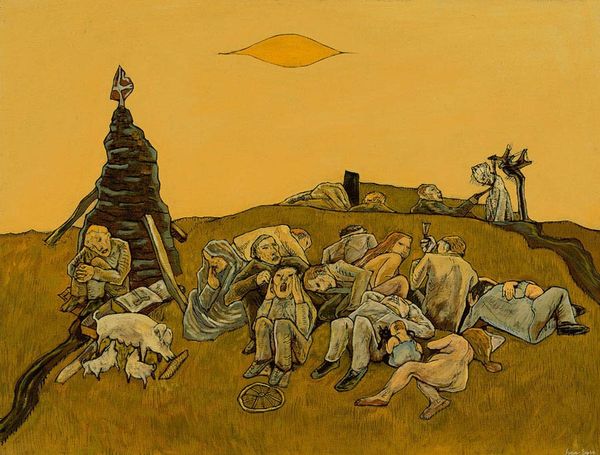 Curator: Benny Andrews created "Leaving Home" in 2004 using acrylic paint. Look at this sparse landscape with its figures poised at the intersection of dwelling and departure. What's your immediate take? Editor: It evokes a profound sense of loneliness and displacement. The muted color palette and the almost cartoonish simplicity of the figures contribute to an overall feeling of melancholy and, frankly, of uprootedness. Curator: Andrews, throughout his career, returned to themes of displacement and the plight of marginalized communities. To understand this piece, it’s important to recognize Andrews' deep commitment to social justice. He himself experienced displacement during the Great Migration. Editor: Yes, situating Andrews's personal history alongside the historical backdrop of forced migrations during the 20th century allows the viewer to address the intersectionality of race, class, and geographical mobility. Look at the faces – we can't see their eyes, a deliberate choice which effectively strips them of individuality. It speaks to a larger crisis of identity born from these kinds of circumstances. Curator: The figures by the cabin are a stark contrast to the broken-down car. Are they being left behind or have they become a new welcoming committee? And what of that dilapidated home—does it offer protection or imprisonment? Editor: I’m especially drawn to how the artist represents gender roles in transition during periods of duress and societal stress. The women standing by the entrance of the cabin embody an anxious stability, a quiet contemplation that seeks refuge and community even in isolation. It reveals much about a shifting domesticity amid immense pressures to adapt, resist, and subsist. Curator: So, how does understanding Andrews' sociopolitical context deepen our reading of "Leaving Home," then? Editor: It highlights the historical continuities between different eras and experiences of migration and allows viewers to see the individuals portrayed as embodying universal challenges to contemporary conditions that perpetuate displacement in its varied forms—environmental, economic, political. Curator: Indeed, art, when coupled with activism, enables audiences to interpret their personal, as well as historical relationships with the work in ways that speak to a contemporary politics of experience. Thank you, that was enlightening. Editor: Thanks to you as well. I leave now with an even greater respect for this very impactful painter.