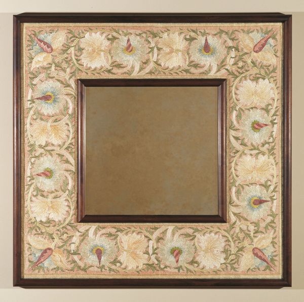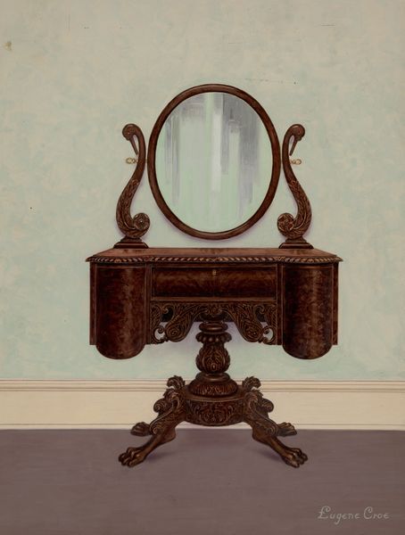 Curator: This intriguing mixed-media drawing, “Mirror, Framed with Wall Paper Panels, Bordered in Tin,” dates from around 1938, and is attributed to Majel G. Claflin. The composition depicts, as the title suggests, a design for a framed mirror. What are your first thoughts on this? Editor: It has an unexpected charm, almost homely. The combination of floral wallpaper patterns with what seems to be tin gives it a handcrafted, almost folk-art feel. There's a warmth and nostalgia present in it. Curator: Yes, I agree. This design reflects a trend within the Art Deco period for incorporating handcrafted elements and democratizing design, pushing back against purely industrial aesthetics. The use of wallpaper is interesting; a humble, domestic material elevated within a design object. Editor: Absolutely. Floral patterns are so often tied to ideas of domesticity, femininity, and even a certain kitsch sensibility. Framing a mirror with such patterns can evoke a feeling of personal identity intertwined with one’s immediate environment. The mirror becomes more than a reflector; it's a statement about one's sense of self. Curator: It is a striking visual shorthand for that era’s anxieties about personal space and expression within a rapidly changing socio-economic landscape. The rise of consumer culture allowed more people to define themselves through decorative objects. Do you see a specific narrative being implied through this arrangement? Editor: I do. The contrasting textures—the soft, repetitive wallpaper against the seemingly hard, almost industrial tin—create an interesting tension. It symbolizes a longing for the handmade amidst the encroaching mass-produced world, an idea very central to 1930s America during the depression era. The mirror as reflection encourages you to ponder the nature of the interior self meeting exterior demands of society. Curator: I agree, the mirroring creates not just a visual doubling but invites deeper introspection about one’s status in society. Thank you. Editor: It’s been a pleasure to explore the meanings embedded within this image. I shall now remember its patterns.